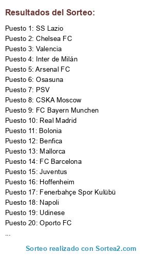 Lista de participantes: Oporto FC, Fenerbahçe Spor Kulübü, Real Madrid, Juventus, Inter de Milán, Manchester City FC, Chelsea FC, SS Lazio, Tottenham, AC Milan, Sevilla FC, Benfica, PSV, Schalke 04, Hoffenheim, FC Bayern Munchen, Osasuna, FC Barcelona, Newcastle, Mallorca, CSKA Moscow, Napoli, Catania, Borussia Dortmund, Bolonia, Everton, Montpellier, Anderlecht, Valencia, Arsenal FC, Udinese.