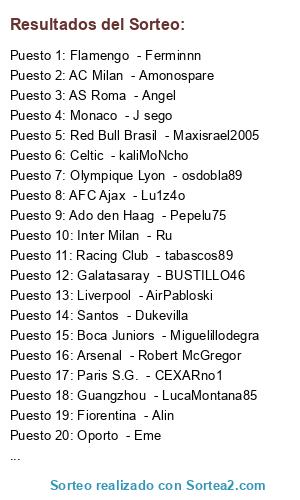 Lista de participantes: AC Milan - Amonospare, PSV Eindhoven - ProRaiven14, Paris S.G. - CEXARno1, Saint Ettiene - eckae, Galatasaray - BUSTILLO46, Flamengo - Ferminnn, Parma - TONY, Independiente - Iborra85, Santos - Dukevilla, Olympique Marsella - mardom81, Celtic - kaliMoNcho, AFC Ajax - Lu1z4o, Liverpool - AirPabloski, Lazio - King magic82, Oporto - Eme, Red Bull Brasil - Maxisrael2005, AS Roma - Angel, Estudiantes La Plata - Rcuervo, Monaco - J sego, Palestino - Sent3nza88, Zenit - pAdRoNe, Olympique Lyon - osdobla89, Boca Juniors - Miguelillodegra, Bayer Leverkusen - Sullendonkey821, Montpellier - Betico2018, Fiorentina - Alin, Guangzhou - LucaMontana85, FC Barcelona - oskarkawa, Ado den Haag - Pepelu75, Inter Milan - Ru, Racing Club - tabascos89, Arsenal - Robert McGregor.