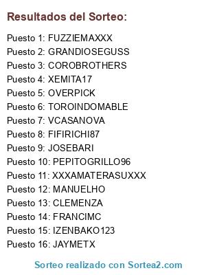 Lista de participantes: Abraveses, adrylito, aladino, alead71, carlosbode10, cazaplanetas, crls, Darkanesp, dijouspaella, DmonSTN, dsanze, edumacca, ferminnn, finestrat, Flywoods, fran lizanco, Garytto, jordi garcia, Jotaveh, kapykua666, K4yser87, linho85, Marvl03, mikelo1982, MrMohamRam, mrtsgi, NandoBel78, Negruxo, NURHIO, ooMERCENARIOoo, outlander, pakiu123, PIN PAN PON PUN, punkythc, RICHIMG, ricre 5, Rikel, Rincon, Robertako, TATO XD, ulimoreno, victub, xemita17, RESERVA 1, RESERVA 2.