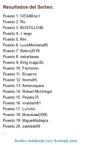 Lista de participantes: Amonospare, ProRaiven14, CEXARno1, eckae, BUSTILLO46, Ferminnn, TONY, Iborra85, Dukevilla, mardom81, kaliMoNcho, Lu1z4o, AirPabloski, King magic82, Eme, Maxisrael2005, Angel, Rcuervo, J sego, Sent3nza88, pAdRoNe, osdobla89, Miguelillodegra, Sullendonkey821, Betico2018, Alin, LucaMontana85, oskarkawa, Pepelu75, Ru, tabascos89, Robert McGregor.