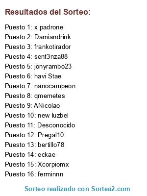 Lista de participantes: ANicolao, bertillo78, Damiandrink, eckae, ferminnn, frankotirador, havi Stae, jonyrambo23, nanocampeon, new luzbel, Pregal10, qmemetes, sent3nza88, x padrone, Xcorpiomx, Desconocido.