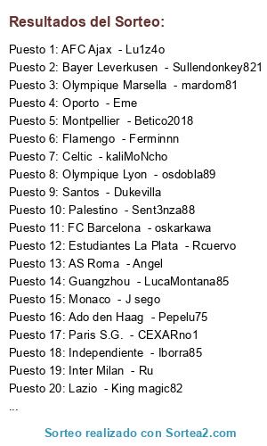 Lista de participantes: AC Milan - Amonospare, PSV Eindhoven - ProRaiven14, Paris S.G. - CEXARno1, Saint Ettiene - eckae, Galatasaray - BUSTILLO46, Flamengo - Ferminnn, Parma - TONY, Independiente - Iborra85, Santos - Dukevilla, Olympique Marsella - mardom81, Celtic - kaliMoNcho, AFC Ajax - Lu1z4o, Liverpool - AirPabloski, Lazio - King magic82, Oporto - Eme, Red Bull Brasil - Maxisrael2005, AS Roma - Angel, Estudiantes La Plata - Rcuervo, Monaco - J sego, Palestino - Sent3nza88, Zenit - pAdRoNe, Olympique Lyon - osdobla89, Boca Juniors - Miguelillodegra, Bayer Leverkusen - Sullendonkey821, Montpellier - Betico2018, Fiorentina - Alin, Guangzhou - LucaMontana85, FC Barcelona - oskarkawa, Ado den Haag - Pepelu75, Inter Milan - Ru, Racing Club - tabascos89, Arsenal - Robert McGregor.