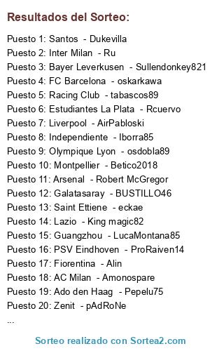 Lista de participantes: AC Milan - Amonospare, PSV Eindhoven - ProRaiven14, Paris S.G. - CEXARno1, Saint Ettiene - eckae, Galatasaray - BUSTILLO46, Flamengo - Ferminnn, Parma - TONY, Independiente - Iborra85, Santos - Dukevilla, Olympique Marsella - mardom81, Celtic - kaliMoNcho, AFC Ajax - Lu1z4o, Liverpool - AirPabloski, Lazio - King magic82, Oporto - Eme, Red Bull Brasil - Maxisrael2005, AS Roma - Angel, Estudiantes La Plata - Rcuervo, Monaco - J sego, Palestino - Sent3nza88, Zenit - pAdRoNe, Olympique Lyon - osdobla89, Boca Juniors - Miguelillodegra, Bayer Leverkusen - Sullendonkey821, Montpellier - Betico2018, Fiorentina - Alin, Guangzhou - LucaMontana85, FC Barcelona - oskarkawa, Ado den Haag - Pepelu75, Inter Milan - Ru, Racing Club - tabascos89, Arsenal - Robert McGregor.