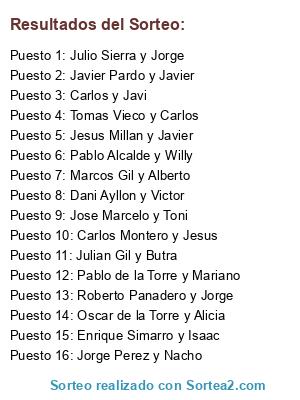 Lista de participantes: Enrique Simarro y Isaac, Carlos y Javi, Jorge Perez y Nacho, Dani Ayllon y Victor, Carlos Montero y Jesus, Roberto Panadero y Jorge, Marcos Gil y Alberto, Julio Sierra y Jorge, Julian Gil y Butra, Jose Marcelo y Toni, Jesus Millan y Javier, Javier Pardo y Javier, Pablo Alcalde y Willy, Tomas Vieco y Carlos, Oscar de la Torre y Alicia, Pablo de la Torre y Mariano.