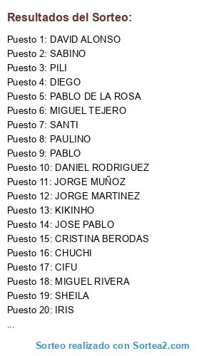 Lista de participantes: JOSE PABLO, SANTI, IRIS, MIGUEL RIVERA, PILI, ALBERTO, LUIS ANGEL, PABLO DE LA ROSA, KIKINHO, PAULINO, JORGE MUÑOZ, JORGE MARTINEZ, KIKE BOLZONI, DANIEL RODRIGUEZ, CRISTINA BERODAS, DIEGO, DAVID ALONSO, SHEILA, CRIS GONZALEZ, CIFU, MIGUEL TEJERO, PABLO, SABINO, CHUCHI, PATRICIA.