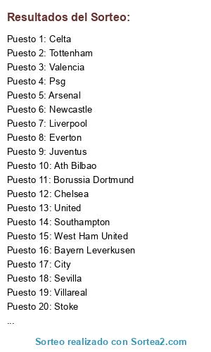 Lista de participantes: Bayern Leverkusen, Borussia Dortmund, Schalke 04, At. Madrid, Valencia, Villareal, Ath Bilbao, Celta, Sevilla, Psg, Lyon, Arsenal, Chelsea, Everton, Liverpool, United, City, Newcastle, Southampton, Stoke, Tottenham, West Ham United, Inter, Milan, Juventus, Napoles.