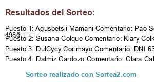 - Ganador 2: Susana Colque Comentario: Klary Colke Yop Mario Altamirano Romi Elizabeth Rocha 429