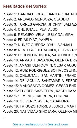 Lista de participantes: AMASIFUEN OCMIN, CESAR AUGUSTO, AREVALO GONZALES, VIORICKA DE JESUS, AREVALO MENDOZA, CLAUDIO, ARMAS HUASANGA, OLENKA BRIZETH, CABALLERO ACOSTA, DENZEL JIUNER, CARHUAJULCA MENOR, VALERY MISHELL, CARRASCO SAAVEDRA, ELOIZA YADIRA, CASTRO SARMIENTO, CARMEN ALICIA, CHUJUTALLI PUA, ALDO, CHUJUTALLI SAN MARTIN, FRANCID DOLYBETS, CRUZ BUSTAMANTE, SANDALI DENERI, DEL AGUILA SANTAMARIA, FREDDY DANIEL, DIAZ SANCHEZ, JOSE ARON, FERNÁNDEZ VILLAVICENCIO, MABEL JHULIANA, FLORES SAAVEDRA , KAORI DAYANARA, FRIAS DIAZ, YANELA, GARCIA PEREA, JUANITA GUADALUPE, GARCIA TORRES, ROXI ALEXANDRA, GIL ORTIZ, RODRIGO FABIANI, GUEVARA GARCIA, NAYRA FRANCISQUITA, JIMENEZ CABRERA, LORENA, LOCONI ORDINOLA, VASTI VICTORIA, MANOSALVA GOMEZ, CESAR ENRIQUE, NATIVIDAD SINOJARA, OLENKA MILHENY, NIEVES LOPEZ, TREYSI SOLEY, NÚÑEZ GUERRA, YHULIA ANJALI, OLIVEROS AVILA, CASANDRA, PALMA PIZARRO, MATIAS, PINCHI LAZO, ROSITA VALENTINA, POMA QUISPE, ANA CRISTINA, PORTILLA GUEVARA, JHOANY MARICHELLI, QUEZADA NAVAS, OLENKA DE JESÚS, RAMIREZ CORRALES, ARIANA NICOLLE, REATEGUI DEL AGUILA, SELVA CRISTINA, RENGIFO VELA, LESLY DALMIRA, ROJAS ROJAS, MARIOLY DALAI, RUIZ RODRIGUEZ SOFIA JOSEFINA, SAAVEDRA REÁTEGUI, OLENKA SOFÍA, SAAVEDRA TORRES, JAKELINE NATALIA, TAFUR BARDALES LUIGI ANDERSON, TORRES GARCIA, JHONNY BALTAZAR, TRIGOZO TORRES , JORGE MARTIN, TUANAMA REATEGUI, MILENKA SALOME, URIARTE GOMEZ, BRYAN LEANDRO.
