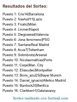 Lista de participantes: Nicolasmathias|Porto, Diegoweed|Valencia, Fnatic|Milan, Linmer|Napoli, Coqe|Man. City, Sotimbrots|Arsenal, Jona.fenomeno|PSG, Acus7|Tottenham, Cris14|Barcelona, Bardock20|Benfica, Boris_azul25|Bayer Munich, Nashoif11|Lazio, SantanaReal Madrid, Eliasudec|Montpellier, Daniel_ignacio|Atletico Madrid, Clarkkent1|Galatasaray.