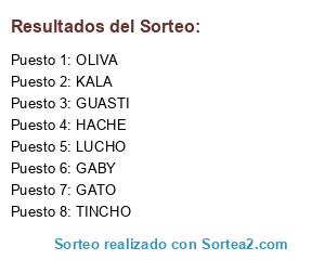 Lista de participantes: HACHE, GABY, OLIVA, GATO, KALA, TINCHO, LUCHO, GUASTI.