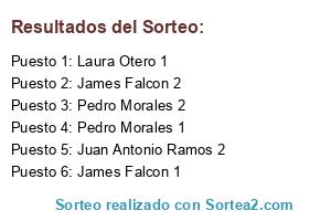Lista de participantes: James Falcon 1, Maribel Eguía 1, Mercedes Miguel 1, Benjamin Boulay 1, Sonia Hidalgo 1, Laura Otero 1, Pedro Morales 1, Fernando Oviol 1, Juan Antonio Ramos 1, James Falcon 2, Maribel Eguía 2, Mercedes Miguel 2, Benjamin Boulay 2, Sonia Hidalgo 2, Laura Otero 2, Pedro Morales 2, Fernando Oviol 2, Juan Antonio Ramos 2.