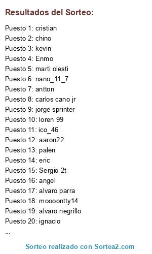 Lista de participantes: Sergio 2t, nandy 2t, angel, alvaro negrillo, loren 99, kevin, mx85, marti olesti, milancito, palen, ico_46, Enmo, moooontty14, nano_11_7, ignacio, chino, aaron22, antton, cristian, alvaro parra, carlos cano jr, jorge sprinter, eric, omar.