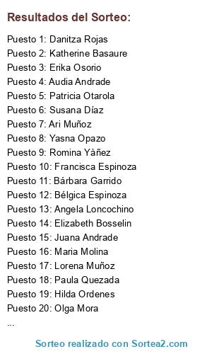 Lista de participantes: Angela Loncochino, Ari Muñoz, Audia Andrade, Bárbara Garrido, Camila Balboa, Danitza Rojas, Elizabeth Bosselin, Erika Osorio, Francisca Espinoza, Hilda Ordenes, Javiera Lopez, Juana Andrade, Katherine Basaure, Lorena Muñoz, Maria Isabel Fuentes, Maria Molina, Mariela Urquiza, Olga Mora, Paola Fuentes, Patricia Otarola, Patricio Pereira, Paula Quezada, Romina Yàñez, Susana Díaz, Victoria Peña, Viviana Peña, Yasna Opazo, Bélgica Espinoza.