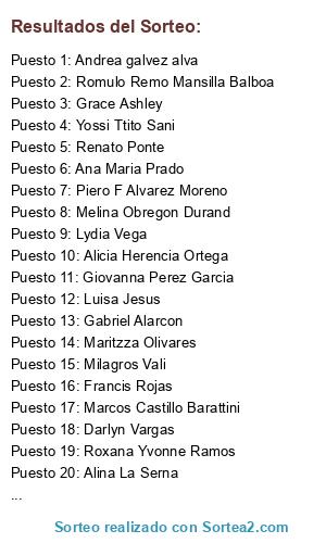 Lista de participantes: Jhomark Silva , Andrea galvez alva, Juan carlos Sanchez, Giovanna Perez Garcia, Luis Brañes Torres, Lidia Rimachi, Raul Fernando Santillan Tuesta, Carlita Obregon Durand, Melina Obregon Durand, Luz Mercedes Palus gaviria, Milagros Vali, Yossi Ttito Sani, Roxana Yvonne Ramos, Silvanna Centti, Marco Antonio Rivas, Maritzza Olivares, Bernardita Salvatierra, Itala Alvarez, Eric Santos P ra, C Maria Sivirichi, Erikiux Renteblass, Einstein Rodriguez, Irma Cahua Paucar, Almendra Prado, Darlyn Vargas, Diana Maribel Garcia, Ana Araceli P, Mel YR, Luisa Jesus, Katzumi Cruz, Ana Ce ahumada, Gina Aldarete, Romulo Remo Mansilla Balboa, Piero F Alvarez Moreno, Elsa Sandra Alejos Jara, Cesar Augusto Castillo Chavez, Victor Eduardo Villafuerte Robles, Iris Ravines Diaz, Lydia Vega, Daniela Tordoya, Carla Centti, Marcos Castillo Barattini, Alina La Serna, Tephy Barreto, Diana Salazar, Alicia Herencia Ortega, Kary Guadalupe Mesia Tirado, Grace Ashley, Vanessa Gutierrez Paz, Maryluz Del Solar Galiano, Paola Martinez Arteaga, Gabriel Alarcon, Haruka Ruth Meza, Geraldine Luz, Cris Ponte, Luz Delia Palomino Sipan, July Elias, Adriana Trujillo, Angie Tica De Contardo, Randolphh PPadilla, Carbar Angie, Francisco Pacheco, Liliana Mena, Emilio Chala Saucedo, Milagros del Carmen chala, Prisci Melendez de romero, Maria Rojas Bailon, Renato Ponte, Margarita Granados, Cruz Vargas, Hugo Bustamante, Ana Maria Prado, Diego Andres Ortiz, Francis Rojas, Luis Diablito, Celene La cruz, Karla Alava, Carlos Alava del Aguila, July Cornejo, Vannessa Jenny Saavedra, Patricia Pacheco, Min Ji, Aurelia Nila G, Nara Kim, Stephannye Ramirez, Anita Lr, Mercedes Gala, Efrain espinoza, .