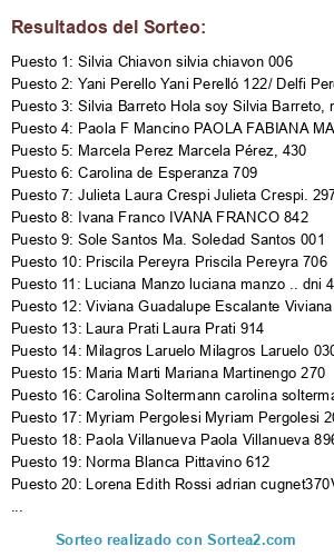 Lista de participantes: Liliana Imwinkelried LILIANA IMWINKELRIED 313, Cynthia Imhof COMPARTIDOOOO OJALA ME TOQUE 289 CINTIA IMHOF, Diego Andres Pigo DIEGO ANDRES PIGO DNI 707, Esmeralda Grandoli ESMERALDA TERESA GRANDOLI 877, Maria Eugenia Noguera Ma. Eugenia Noguera 512, Marcela Perez Marcela Pérez, 430, Mercedes Grismado MERCEDES GRSMADO ---486, Andrea Cugnet Andrea Cugnet 302Ver traducción, Analia Lespinard Analia Veronica Lespinard 503, Sole Villalba Soledad villalba 787, Fabian Dardel 210, Jorgelina Schneider Jorgelina Schneider 002, Yuse Zalazar Jose Zalazar 265Ver traducción, Vanina Bibiloni de Lambret vanina bibiloni 400, Cami Manera Me encantaría ganarlo para que vayan mis abuelos! Manera Camila 869, Lali Vallejo Atenas Vallejo 949, Belu Bachi María Belén Bacci 196, Isabel Baranelli isabel baranelli840Ver traducción, Maria Godoy gimenez dora 618, Castaño Macarena castaño macarena 510, Debora Cisnero Debora Cisnero 210, Zulema Melo zulema florencia melo 898, Gise Salum Salum gisela 377, Maria Rosa Aranda 919, Mirna Speranza Mirna speranza 358, Roberto Trabuchi Roberto Trabuchi 519, Gisela Ramseyer Gisela Ramseyer 882, Cris G. Sosa Ermácora Sosa Cristinb 342, Hilda Estela Gomez HILDA ESTELA GOMEZCOMPARTIDO 689, Mariángeles Amico Mariángeles Amico 527, Carolina de Esperanza 709, Graciela Rodriguez Graciela Rodríguez 923, Pablo Rios Rios, Pablo J. 143, Vivii Lanzetti Viviana lanzetti 993, Monica Torres Monica Torres 780, Silvia Inés Castro Silvia Castro 628, Sole Duran Soledad Durán 013, Mercedes Rosa Jose mercedes jose 113, Elsa Moreyra Elsa Moreyra COMPARTIDO 943, Marilyn Luzzi marina luzzi 416, Nancy Yozia Nancy Yozia 217, Cristina Baranoski Cristina Baranoski 460, Jesica Mansilla Bassi Mansilla jesica 669, Bibiana Biga BIBIANA BIGA 438, Cely Carreras Celia carreras 298, Araceli Martinez araceli martinez 792, Lorena Jaqui LORENA GAMBOA 594Ver traducción, Santino Cuñe Maria Jose Arias 274, Jose Maria Ramon Benitez jose maria ramon benitez 906, Carolina Galdon Maria Carolina galdon 447, Myriam Pergolesi Myriam Pergolesi 205, Liliana Gomez Cello LILIANA GOMEZ CELLO 464, Silvina Corraro corraro silvina 794, Alcira Miranda ISABEL MIRANDA 316, Adriana Morero Adriana Morero347, Camila Argañaraz Camila Argañaraz, 545, Cristian Forestieri cristian Forestieri 873Ver traducción, María Iglesias Maria Iglesias-973, Vivi Cejas Viviana Cejas 095, Norma Blanca Pittavino 612, Ivo Ferrari ivo ferrari 798, Susana Giraudo susana giraudo 977, Marcelo Luis Barontini 909. gracias, Patricia Rodriguez Patricia Rodriguez 256, Miguel Angel Alifano Miguel Angel Alifano 320, Marta Gonzalez marta gonzalez 793, Griselda Gomez griselda gomez 035, Mabel Dallard Dallard, Mabel 229, Pamela Toranzo pamela toranzo 639, Guillermo Larrosa Guillermo larrosa 213, Ivonne Raimondi ivonne Raimondi 786Ver traducción, Vane Nuñez vanesa nuñez 764, Ivana Franco IVANA FRANCO 842, Clara Trionfini clara trionfini 635, Ana Claudia Galetti Ana Claudia Galetti 562, Mariana Lorena Eggel de Carnevali Mariana Eggel 797, Griselda Ramella GRISELDA RAMELLA 770, María Angélica Mascheroni Ermácora María Angélica Mascheroni 937, Silvana Rossler silvana rossler 481Ver traducción, Adrian Gilabert Adrian Gilabert 484, Ana Isabel Talvard Ana Isabel Talvard 316 Quiero conocer San Rafael., Alejandra Fernandez 021!,compartido, Marcela Escobar Marcela Escobar 880, Antonela Maciel Antonela Maciel 822, Ágata Lorena Diburzi Agata Diburzi 256, Rocío Lizondo Rocío Lizondo 223, Valeria Brondino Valeria Brondino 949Ver traducción, Gladis Guadalupe Alem Gladis Guadalupe Alem 079, Haidee Perussini HAIDEE PERUSSINI 596, Lorena Edith Rossi lorena rossi 780, Ana Maria Bordino ANA MARIA BORDINO 049, Alejandrina Seghesso seghesso, maria 539, Marina Musso Marina Musso 248, Eugenia Gonza María Eugenia González 174, Maira Pierini maira pierini 234, Paola Mendez Mendez paola 860, Sole Santos Ma. Soledad Santos 001, Priscila Pereyra Priscila Pereyra 706, Silvia Peralta dni 933, Schifitto Andrea schifitto andrea 436, Eliiset Emilio Julieta Diaz 613, Sofi Massi Massi Sofía 095, Ariel Maradona nestor ariel maradona.806, Chile Leclerc CHILE 960Ver traducción, Graciela Tacca GracielaTacca 344, Alcira Weggener 439, Claudio Raul Ramirez Ramirez Claudio Raul 164, Marcela Chena Marcela Chena 954, Valenchu Hoffmann Hoffmann valeria 002 , Cecilia Tchr Cecilia Echeverri 020Ver traducción, Maialen Iguri mailen iguri 751, Fer Fer Fernanda Fernandez 215, Maria Ines Laurini MARIA INES LAURINI 089Ver traducción, Mariela Vilche mariela vilche 738, Lore Vento Lorena vento 681, Gabriel J. Sanabria Gabriel Sanabria 114, Rosi Rv Rosa ferino 125., Silvina Acosta Acosta, Silvina, DNI 327, Paola Campos paola campos 288, Arnaudo Florencia Arnaudo, Florencia DNI: 199, Mayi Yi Paula 290, Clau Dia Portells CLAUDIA 080, Judith Chirazi Chirazi judith 933Ver traducción, Andrea Aguirre Andrea Aguirre 405, Isabel Cardellino Isabel Cardellino 508, Sofi Palacín SOFÍA PALACÍN, 367., María Eugenia Paniagua Maria Eugenia Paniagua 457, Bea Arredondo beatriz arredondo 485, Antonela Paulazzo Antonela Paulazzo 752, Gladis Z. Bertoluzzi gladis bertoluzzi 878, Caro Wolf Carolina Wolf 493Ver traducción, Pierina Palermo 404, Patricia Boscarol Boscarol, Patricia DNI 954, Vero G Andrian Gomez veronica,284Ver traducción, Fabiana Marquez Calderon fabiana marquez 307, Maren Escalada Maren Escalada 501, Sandra Medina 567, Santa Fe Tarjetas Jose freyre 343Ver traducción, Iris Rivas Iris Rivas 477Ver traducción, Claudia Cescato Claudia Cescato 111Ver traducción, Caro Avellaneda Perez Carolina Avellaneda 475, Ana Izquierdo Ana Maria Sisco de Izquierdo:794, Susana Poncino Susana Poncino 833, Juan Carlos Dominguez Chueco Juan Carlos Dominguez 897, Triny Franzotti Franzotti Trinidad 105, Silvia Chiavon silvia chiavon 006, Adriana Vuskovich Adriana Vuskovich 155, Chuken China carlos marzano 894, Lorena Edith Rossi adrian cugnet370Ver traducción, Evangelina Beatriz Peralta Eva