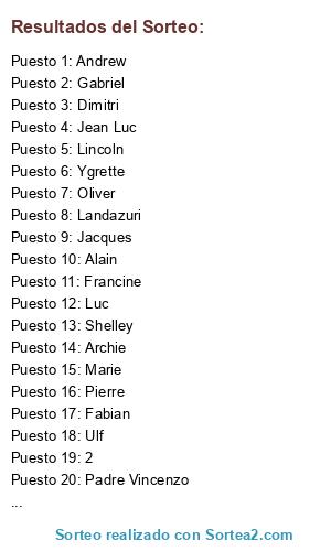 Lista de participantes: Alain, Andrew, Archie, Celia, Dimitri, Fabian, Francine, Gabriel, Gaelle, Jacques, Jean Luc, Landazuri, Lincoln, Luc, Marie, Oliver, Padre Vincenzo, Pierre, Shelley, Ulf, Ygrette, 1, 2.