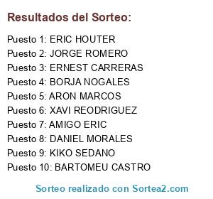Lista de participantes: JORGE ROMERO, ARON MARCOS, ERNEST CARRERAS, DANIEL MORALES, BARTOMEU CASTRO, ERIC HOUTER, BORJA NOGALES, KIKO SEDANO, XAVI REODRIGUEZ, AMIGO ERIC.