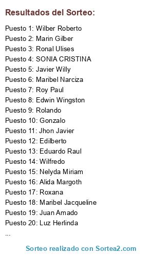 Lista de participantes: Jhon Javier, Edilberto, Pamela, Vilma Isabel, Jhonny, Antonio, María, Godofredo, Mary Luz, Liz Helen, Thania Carolay, Yony Marta, Zulma Beatriz, Edgar, Renzo Jhonn, Rosa Sarita, Eduardo Raul, Beatriz Josefina, Franklin, Edin Angel, Nery Soledad, Eder Yeison, Isidro, Victor Hugo, Percy, Luis Mario, Victor Antonio, Yamil Victor, Benito Carlos, Silvana, Frank Ulises, Bernardino, Yessica, Nohely Alejandrina, Keiko Sofía, Jose Luis, Guinna, Yhoshy Emiluz, Juan Amado, Dein Rigoberto, Anely, Jorge, Nelyda Miriam, Agueda Margot, Brahyan Jhunior, Katherin Marianee, Rhusso, Rolando Wilber, Jose Alberto, Water Mario, Eduardo, Cinthia Nelida, Alida Margoth, Javier Willy, Juan Carlos, Aderling Joel, Justo, Efrain, Saida, Linio, Alexander Elias, Yaquelin, Jhonatan, Maria De Los Angeles, Rufino Julian, Maribel Narciza, Claudio Francisco, Guido Samuel, Lisbeth Katy, Wily, Jacinto, Mauro, Wilber, Martin, Edwin Avilés, Javier Elvis, Gonzalo, Julio Cesar, Carlos Alberto, Milton Kadu, Edwar William, Ronal Ulises, Jose Alfredo, Efraín, Delia Marina, Flavio, Benjamín, Roxana, José Ramón, Victoria, Julio César, Wilfredo, Giovanni Froiland, Jose Antonio, Dianeth Yudy, Aurelio, Fray Luis, Jhosmel Romario, Luz Clarita, Rhuben Quincinio, Ronald, Tomas Ponciano, Jose Amador, Mario Angel, Denis Julio, Paulino, Ceferino, Cirilo, Franco Lazaro, Cynthia Benilda, Gladys, Beatriz Bertha, Rolando, Dickson Kennedy, Rober, Edwin Wingston, Dolores Turpo Ccori, Edgar Ismael, Roberto, Henrry, Angel Miguel, Juan Arcadio, Roy Paul, Sebastian, Viki Zoraida, Susy, David, Jesus, Edith Marina, Juana Josefina, Renato Johan, Alex Christian, Katya Maritza, Zulma Saly, Gema Raquel, Wilber Roberto, Gido, Marin Gilber, Julio Nolasco, Rudy, Isabel, Ruth Deysi, Yaneth Ruzmelia, Julián, Joseph Jeffers, Vilma, Yamilet Esmeralda, Yesica, SONIA CRISTINA, Fray, Juan Daniel, Niña Katy mishell, Belinda Rhosmerica, JUANA JUDITH, Roddy Felix, WILSON DARIO, Magali Margoth, Luz Herlinda, Roxana Ruth, FIORELLA, HENRY GROVER, Maribel Jacqueline, LEONIDAS, Gabi Nohemi, Hebert, Eduardo Alfredo, JUAN EDGAR, Pedro Wilber, Juan Víctor, Susy Milagros, Jhuver Leonar.
