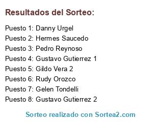 Lista de participantes: Danny Urgel, Gelen Tondelli, Gildo Vera 2, Gustavo Gutierrez 1, Gustavo Gutierrez 2, Hermes Saucedo, Pedro Reynoso, Rudy Orozco.