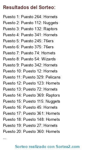 Lista de participantes: Puesto 1: Raptors, Puesto 2: Hornets, Puesto 3: Timberwolves, Puesto 4: Hornets, Puesto 5: Hornets, Puesto 6: Hornets, Puesto 7: Nuggets, Puesto 8: Timberwolves, Puesto 9: 76ers, Puesto 10: Hornets, Puesto 11: Pelicans, Puesto 12: Hornets, Puesto 13: Hornets, Puesto 14: Hornets, Puesto 15: Hornets, Puesto 16: Raptors, Puesto 17: Hornets, Puesto 18: Hawks, Puesto 19: Hornets, Puesto 20: Wizards, Puesto 21: Hornets, Puesto 22: Hornets, Puesto 23: Hornets, Puesto 24: Hornets, Puesto 25: Hornets, Puesto 26: Pelicans, Puesto 27: Hornets, Puesto 28: Pelicans, Puesto 29: Timberwolves, Puesto 30: Timberwolves, Puesto 31: Hornets, Puesto 32: Hornets, Puesto 33: Raptors, Puesto 34: Hornets, Puesto 35: Hornets, Puesto 36: 76ers, Puesto 37: Hawks, Puesto 38: Timberwolves, Puesto 39: Raptors, Puesto 40: Hornets, Puesto 41: Hornets, Puesto 42: Hornets, Puesto 43: Pelicans, Puesto 44: Hornets, Puesto 45: Hornets, Puesto 46: Nuggets, Puesto 47: Nuggets, Puesto 48: Hornets, Puesto 49: Hornets, Puesto 50: Raptors, Puesto 51: Hornets, Puesto 52: Hornets, Puesto 53: Timberwolves, Puesto 54: Wizards, Puesto 55: Hornets, Puesto 56: Hornets, Puesto 57: Hornets, Puesto 58: Hornets, Puesto 59: Hornets, Puesto 60: Hornets, Puesto 61: Hornets, Puesto 62: Nuggets, Puesto 63: Hornets, Puesto 64: 76ers, Puesto 65: Wizards, Puesto 66: Hornets, Puesto 67: Hornets, Puesto 68: Hornets, Puesto 69: Pelicans, Puesto 70: 76ers, Puesto 71: Hornets, Puesto 72: Hornets, Puesto 73: Hornets, Puesto 74: Hornets, Puesto 75: Hornets, Puesto 76: Hornets, Puesto 77: Raptors, Puesto 78: Hornets, Puesto 79: Hornets, Puesto 80: Hornets, Puesto 81: Nuggets, Puesto 82: Hornets, Puesto 83: Hornets, Puesto 84: Hornets, Puesto 85: Wizards, Puesto 86: Pelicans, Puesto 87: Hornets, Puesto 88: Hornets, Puesto 89: Nuggets, Puesto 90: Hornets, Puesto 91: Hornets, Puesto 92: Hornets, Puesto 93: Hornets, Puesto 94: Raptors, Puesto 95: Hornets, Puesto 96: Pelicans, Puesto 97: Hornets, Puesto 98: Hornets, Puesto 99: Hornets, Puesto 100: Hornets, Puesto 101: Hornets, Puesto 102: Raptors, Puesto 103: Hornets, Puesto 104: Hornets, Puesto 105: Hornets, Puesto 106: Hornets, Puesto 107: Wizards, Puesto 108: Hornets, Puesto 109: Hornets, Puesto 110: Nuggets, Puesto 111: Hornets, Puesto 112: Nuggets, Puesto 113: Hornets, Puesto 114: Hornets, Puesto 115: Nuggets, Puesto 116: Hornets, Puesto 117: Pelicans, Puesto 118: Hornets, Puesto 119: Wizards, Puesto 120: 76ers, Puesto 121: Timberwolves, Puesto 122: Hornets, Puesto 123: Hornets, Puesto 124: Hornets, Puesto 125: Hornets, Puesto 126: Hornets, Puesto 127: Hornets, Puesto 128: Hornets, Puesto 129: Hornets, Puesto 130: Hornets, Puesto 131: Hornets, Puesto 132: Raptors, Puesto 133: 76ers, Puesto 134: Timberwolves, Puesto 135: Timberwolves, Puesto 136: Hornets, Puesto 137: Hornets, Puesto 138: Raptors, Puesto 139: Hornets, Puesto 140: Hornets, Puesto 141: Hornets, Puesto 142: Hornets, Puesto 143: Hawks, Puesto 144: Hornets, Puesto 145: Hornets, Puesto 146: Pelicans, Puesto 147: 76ers, Puesto 148: Hornets, Puesto 149: Hornets, Puesto 150: Hornets, Puesto 151: Timberwolves, Puesto 152: Hornets, Puesto 153: Hornets, Puesto 154: Hawks, Puesto 155: Timberwolves, Puesto 156: Nuggets, Puesto 157: Hawks, Puesto 158: Hornets, Puesto 159: Wizards, Puesto 160: Hornets, Puesto 161: Hornets, Puesto 162: 76ers, Puesto 163: Hornets, Puesto 164: Hornets, Puesto 165: Hornets, Puesto 166: Hornets, Puesto 167: Hornets, Puesto 168: Hornets, Puesto 169: Hornets, Puesto 170: Timberwolves, Puesto 171: Hornets, Puesto 172: Hornets, Puesto 173: Hornets, Puesto 174: Hornets, Puesto 175: Hornets, Puesto 176: Hornets, Puesto 177: Hornets, Puesto 178: Timberwolves, Puesto 179: Hornets, Puesto 180: Hornets, Puesto 181: Hornets, Puesto 182: Nuggets, Puesto 183: Hornets, Puesto 184: Hornets, Puesto 185: 76ers, Puesto 186: Hornets, Puesto 187: Raptors, Puesto 188: Hornets, Puesto 189: Hornets, Puesto 190: Hornets, Puesto 191: Nuggets, Puesto 192: Hornets, Puesto 193: Hornets, Puesto 194: Timberwolves, Puesto 195: Hornets, Puesto 196: 76ers, Puesto 197: Hornets, Puesto 198: Hornets, Puesto 199: 76ers, Puesto 200: Nuggets, Puesto 201: Hornets, Puesto 202: Timberwolves, Puesto 203: Raptors, Puesto 204: Hornets, Puesto 205: Nuggets, Puesto 206: Nuggets, Puesto 207: Hornets, Puesto 208: Hawks, Puesto 209: Hornets, Puesto 210: Hawks, Puesto 211: Hornets, Puesto 212: Hornets, Puesto 213: 76ers, Puesto 214: Hornets, Puesto 215: Hornets, Puesto 216: Timberwolves, Puesto 217: Nuggets, Puesto 218: Timberwolves, Puesto 219: Raptors, Puesto 220: Hornets, Puesto 221: Hornets, Puesto 222: Hornets, Puesto 223: Hornets, Puesto 224: Hornets, Puesto 225: Timberwolves, Puesto 226: Hornets, Puesto 227: Timberwolves, Puesto 228: Nuggets, Puesto 229: Hornets, Puesto 230: Nuggets, Puesto 231: Hornets, Puesto 232: Hornets, Puesto 233: Raptors, Puesto 234: Raptors, Puesto 235: Hornets, Puesto 236: Raptors, Puesto 237: Hornets, Puesto 238: Hornets, Puesto 239: Timberwolves, Puesto 240: Nuggets, Puesto 241: Hornets, Puesto 242: Hornets, Puesto 243: Hornets, Puesto 244: Hornets, Puesto 245: 76ers, Puesto 246: Hornets, Puesto 247: Hornets, Puesto 248: Hornets, Puesto 249: Hornets, Puesto 250: Hornets, Puesto 251: Hornets, Puesto 252: Hornets, Puesto 253: Nuggets, Puesto 254: Hornets, Puesto 255: Wizards, Puesto 256: Hornets, Puesto 257: Hawks, Puesto 258: Hawks, Puesto 259: 76ers, Puesto 260: Pelicans, Puesto 261: Hornets, Puesto 262: Hornets, Puesto 263: Hornets, Puesto 264: Hornets, Puesto 265: Hornets, Puesto 266: Hornets, Puesto 267: Raptors, Puesto 268: Hornets, Puesto 269: Hornets, Puesto 270: 76ers, Puesto 271: Hornets, Puesto 272: Hornets, Puesto 273: Hornets, Puesto 274: Hornets, Puesto 275: Hornets, Puesto 276: Raptors, Puesto 277: Hornets, Puesto 278: Raptors, Puesto 279: Hornets, Puesto 280: Wizards, Puesto 281: Hornets, Puesto 282: Hornets, Puesto 283: Hornets, Puesto 284: Hornets, Puesto 285: Hornets, Puesto 286: Hornets, Puesto 287: Horn