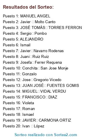 Lista de participantes: FRANCISCO JAVIER, RAUL, FRANCISCO TOMAS MATAIX GISBERT, CARLOS BELTRÁ TAUSTE, RUBÉN FERNÁNDEZ ARMENGOL, ROSA, ALEJANDRO MADRID SALVADOR, JAVIER CARMONA ORTIZ, JAVIER CARMONA GINER, JUAN JOSÉ FUENTES GOMIS, MARIA JOSE GINER GINER, RUTH, MANUEL ANGEL, JOSÉ TOMÁS TORRES FERRON, JUAN PEDRO, DIETER GÜNTHER FLEMM, JOSÉ RAÚL LEAL VILAR, MIGUEL VIDAL VERDU, DAVID GARRIGOS, ROMAN VOEVODIN, FRANCISCO DIAZ, RAUL PEREZ, Emilio Perez, Pablo, ALEJANDRO, Francisco Almagro Ruiz, David Maltes, Ivan Penalva, Javier Molto Canto, Maria, Jorge Ribera Romeu, Sergio Pombo, Francisco Javier espin nieto, Maria Gomez, Ismail, ALEJANDRO Moreno Soler, Luis Valero Torres, Pablo de Alba, Oriol Gilabert, Pedro Ramón garví aragonés, Emilio Pérez, Gonzalo, Ivan López, Javier Navarro Rodenas, Roberto Martinez Lillo, Juani Ruiz Ruiz, Ismael, Irene, Jose Gregorio Vicedo, Jose Manuel, DAVID Guijarro López, Daniel, Victor, Enrique, Jose Manuel lloret bustos, Amin, Francico Javier, Josefa Ferrer Requena, Jose Rueda Escoto, Tania Faedo, Roman, Rosa Mas Rosique, Violeta, Conchita San Jose Monje, Adrián Cerón Perez.