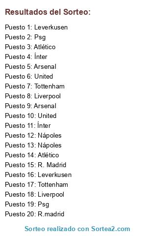 Lista de participantes: Ínter, Ínter, R.madrid, R. Madrid, Liverpool, Liverpool, Leverkusen, Leverkusen, Nápoles, Nápoles, Psg, Psg, Atlético, Atlético, Tottenham, Tottenham, Arsenal, Arsenal, United, United.