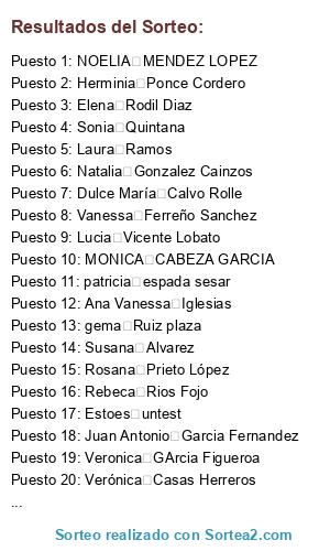 Lista de participantes: Arantxa Ramos Alonso, Jesus Cabanillas Fernández, Beatriz Lima Gomez, Carlos Costa, m angeles Gonzalez ferreras, Luis Miguel Muñoz Capitan, Gema Chouciño Casreo, S. S., Sara Garcia, Yolanda López Vázquez, JOSE ANGEL COLLAZO CARRERA, Daniel Varela Martínez, prueba prueba, Teresa Hernandez Martín, Rocio Alonso Sánchez, Javier Garcia Bello, MAR(abuela) camunas, Maria Hermosilla Martinez, mercedes alvarez hernández, Maria del mar marin muñoz, NOELIA MENDEZ LOPEZ, Veronica Cruces, maria sonia perez gonzalez, Susana Cea Mirazo, Esther Crespo galán, Manoli Ruiz Fernandez, patricia espada sesar, vicente bellido, merche bellido, vicentin bellido, Juan Antonio Garcia Fernandez, Lucia Vicente Lobato, Loli Martinez Rivas, Raquel Amor mosteiro, Francisco José Rodríguez Román, iker González piñeiro, Rita Reza Losada, Olga Alonso Rial, loreto barros eiras, María. Isabel Romero Gonzalez, Irene Iglesia Fernandez, María jose Sánchez García, Silvia Andrés perez, Paula Campos González, leticia sabio mañana, MONICA CABEZA GARCIA, Ana Parra, Raquel Pérez Mejuto, Jose Manuel Gallego Naya, Rubén Fernández Jorge, Navia Yuguero Paniagua, Cristina Rodríguez méndez, María Jesús Expósito Martín, Nerea Andrade Trillo, Noa Saavedra Allegue, Sheila Alvarez Fernandez, Oscar Jiménez Guijarro, Cristina Sola, silvia amat garcia, Sonia Quintana, Fátima hachoum Harouch, Leticia Tascón Hernangomez, Obdulia Martínez garcía, Fernando Precedo García, Teresa duarte negreira, Javier del amo de la iglesia, ana vanessa sal fernandez, Rocio Jorge Perez, Marta Esparzaz Sánchez, Miguel Lumbres Llontop, Valentina Alvarez Mosquera, Noelia Méndez trigo, laura ochoa rabanedo, Ana Cano benedicto, Elena Rodil Diaz, Beatriz tenreiro pena, YOLANDA GONZALEZ FARTO, rocio benitez dominguez, manuela álvarez, Rita Fernández Díaz, Dulce María Calvo Rolle, Laura Trigo moreno, Noelia Martínez Macias, Ana M Molina Montilla, Matilde Cañón Díaz, Virginia Bayona, sol terron, Carolina Lema, Maria Canut Pérez, Inés Fernández Abeledo, Jessica García lara, Cristina Pereira, Carmen Sequera Rodriguez, Isabel Miranda, Hector Sancho Zapata, lucia gonzalez rodriguez, maria soria vargas, GEORGINA PLANS SAGUES, Francisco Miralles chico, Inma Soldan Jaen, silvia sanz aznar, Yolanda maria Gomez Campelle, Paula Álvarez Gonzalez, Manuel Daniel Vazquez Pardo, Marcos contreras, Arianna Garcia Fernandez, Irene García Tasende, maria jesus araujo balbuena, Beatriz Procas Elorri, ana garcia, Verónica Casas Herreros, Mª Remedios Jiménez Gálvez, Silvia Rojas obregon, Monica Paradas, Lorena Galarraga Ramírez, Carmen Tamayo, Laura Ortega González, Fede Fernández aspa, Ariadna Moreno Barragan, Noemi Espino fernandez, Eva Casanovas sanz, Jennifer Ferriz santos, Mari marmrn Martin de andres, carmen garcía nuñez, Carmen Gomez Poza, NoeliA Banderas, María Cañón Díaz, miguel rivas varela, Vanessa Ferreño Sanchez, Maria Gonzalez Bellon, Rebeca Rios Fojo, Juan Castañon martinez, Inmaculada Varela Fernández, Claudia Alonso Soto, Patricia Lopez gallego, Estefania Martínez garcia, nohemi acebes romero, Ana Otero Fernandez, oscar catalan moreno, Veronica Hermo Catoira, Susana Alonso Vazquez, Veronica GArcia Figueroa, Laura Ramos, Juan Peres, Estoes untest, Ana Vanessa Iglesias, Raquel Roy Rodríguez, Jose Antonio Lopez Fraga, Sofia Fazanes Souto, carmen porras martinez, Natalia Gonzalez Cainzos, Ivett Lopez Vergara, Vanessa González Prieto, Miriam Martin, Raquel Benitez soriano, Laura Búrdalo Fernández, Pilar Marin Sanchez, esther boquete rama, Ainhoa Manuel Diez, Maria Alvarez Bernardez, Virginia yemas, gabriela gonzalez rodriguez, Jose Martinez, Maria Jose Romero Hernandez, Isabel Iglesias alonso, Belen Garcia Alvarez, sandra madero valle, Sandra Roibas Corredoiras, Montse Carrion colacio, verónica artime busto, Cristina Ricart mir, Tamara Martinez, Deyanira Ger Her, Jessica Lendoiro longueira, eva montoro moles, Blanca Jiménez cea, susana muñiz alvarez, ismael Cascales Rodriguez, Raquel Rueda González, Patricia Negro avalos, José a Cabello gonzalez, lola gonzalez Martín, Susana Alvarez, Isa Bal, Elena Moral Molero, Rafael Pelayo Colodrero, Mercedes Abril Ortega, silvia gracia, Laura Lagares González, Ana Rodríguez cascajosa, Alfonso Atienza Navarro, Rosana Prieto López, Herminia Ponce Cordero, Verónica Tejero, Sandra Bartolome del alamo, Milagros Torrado Cespón, Inmaculada Muñoz Garcia, Jessica Gestoso Mañasco, Fernando Carvajal Noriega, LIDON PEREZ, Miren Alazne Muñoz Gallardo, gema Ruiz plaza, nerea duarte, Crisanta Balado conde, Paloma Otero Cruz, Mercedes Lozano garcia, Noemi Macias Alonso, Eva María González Suárez, Estefania Dominguez Pensado, encarnacion diaz manteca, Nerea Carcas serrano, Sofía Franco Bolón, isabel perez rodriguez, Estela Berná Hernando.