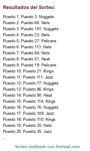 Lista de participantes: Puesto 1: Nuggets, Puesto 2: Kings, Puesto 3: Nuggets, Puesto 4: Jazz, Puesto 5: Heat, Puesto 6: Nuggets, Puesto 7: Pelicans, Puesto 8: Nuggets, Puesto 9: Nuggets, Puesto 10: Nuggets, Puesto 11: Nets, Puesto 12: Nuggets, Puesto 13: Heat, Puesto 14: Pelicans, Puesto 15: Jazz, Puesto 16: Nuggets, Puesto 17: Heat, Puesto 18: Jazz, Puesto 19: Pelicans, Puesto 20: Jazz, Puesto 21: Kings, Puesto 22: Nets, Puesto 23: Nuggets, Puesto 24: Heat, Puesto 25: Nets, Puesto 26: Nuggets, Puesto 27: Pelicans, Puesto 28: Nets, Puesto 29: Kings, Puesto 30: Jazz, Puesto 31: Nuggets, Puesto 32: Kings, Puesto 33: Heat, Puesto 34: Kings, Puesto 35: Jazz, Puesto 36: Nuggets, Puesto 37: Heat, Puesto 38: Nuggets, Puesto 39: Nets, Puesto 40: Nets, Puesto 41: Heat, Puesto 42: Pelicans, Puesto 43: Heat, Puesto 44: Heat, Puesto 45: Nets, Puesto 46: Nuggets, Puesto 47: Nets, Puesto 48: Heat, Puesto 49: Nuggets, Puesto 50: Nuggets, Puesto 51: Heat, Puesto 52: Jazz, Puesto 53: Jazz, Puesto 54: Nets, Puesto 55: Kings, Puesto 56: Pelicans, Puesto 57: Pelicans, Puesto 58: Heat, Puesto 59: Nets, Puesto 60: Nets, Puesto 61: Nets, Puesto 62: Heat, Puesto 63: Kings, Puesto 64: Nuggets, Puesto 65: Nets, Puesto 66: Nets, Puesto 67: Pelicans, Puesto 68: Nets, Puesto 69: Kings, Puesto 70: Nuggets, Puesto 71: Pelicans, Puesto 72: Nuggets, Puesto 73: Nets, Puesto 74: Nuggets, Puesto 75: Nuggets, Puesto 76: Nuggets, Puesto 77: Nuggets, Puesto 78: Nets, Puesto 79: Nuggets, Puesto 80: Heat, Puesto 81: Kings, Puesto 82: Nuggets, Puesto 83: Pelicans, Puesto 84: Nets, Puesto 85: Heat, Puesto 86: Kings, Puesto 87: Pelicans, Puesto 88: Kings, Puesto 89: Nuggets, Puesto 90: Heat, Puesto 91: Kings, Puesto 92: Nets, Puesto 93: Heat, Puesto 94: Nuggets, Puesto 95: Jazz, Puesto 96: Heat, Puesto 97: Kings, Puesto 98: Nets, Puesto 99: Jazz, Puesto 100: Nets, Puesto 101: Nuggets, Puesto 102: Nuggets, Puesto 103: Jazz, Puesto 104: Heat, Puesto 105: Pelicans, Puesto 106: Nuggets, Puesto 107: Nuggets, Puesto 108: Nuggets, Puesto 109: Jazz, Puesto 110: Kings, Puesto 111: Jazz, Puesto 112: Nuggets, Puesto 113: Nets, Puesto 114: Kings.