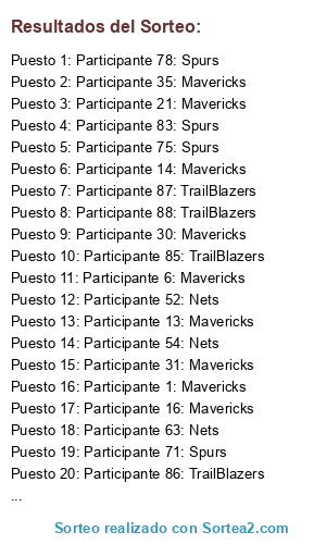 Lista de participantes: Participante 1: Mavericks, Participante 2: Mavericks, Participante 3: Mavericks, Participante 4: Mavericks, Participante 5: Mavericks, Participante 6: Mavericks, Participante 7: Mavericks, Participante 8: Mavericks, Participante 9: Mavericks, Participante 10: Mavericks, Participante 11: Mavericks, Participante 12: Mavericks, Participante 13: Mavericks, Participante 14: Mavericks, Participante 15: Mavericks, Participante 16: Mavericks, Participante 17: Mavericks, Participante 18: Mavericks, Participante 19: Mavericks, Participante 20: Mavericks, Participante 21: Mavericks, Participante 22: Mavericks, Participante 23: Mavericks, Participante 24: Mavericks, Participante 25: Mavericks, Participante 26: Mavericks, Participante 27: Mavericks, Participante 28: Mavericks, Participante 29: Mavericks, Participante 30: Mavericks, Participante 31: Mavericks, Participante 32: Mavericks, Participante 33: Mavericks, Participante 34: Mavericks, Participante 35: Mavericks, Participante 36: Mavericks, Participante 37: Mavericks, Participante 38: Mavericks, Participante 39: Mavericks, Participante 40: Mavericks, Participante 41: Mavericks, Participante 42: Mavericks, Participante 43: Mavericks, Participante 44: Mavericks, Participante 45: Mavericks, Participante 46: Mavericks, Participante 47: Mavericks, Participante 48: Mavericks, Participante 49: Mavericks, Participante 50: Mavericks, Participante 51: Nets, Participante 52: Nets, Participante 53: Nets, Participante 54: Nets, Participante 55: Nets, Participante 56: Nets, Participante 57: Nets, Participante 58: Nets, Participante 59: Nets, Participante 60: Nets, Participante 61: Nets, Participante 62: Nets, Participante 63: Nets, Participante 64: Nets, Participante 65: Spurs, Participante 66: Spurs, Participante 67: Spurs, Participante 68: Spurs, Participante 69: Spurs, Participante 70: Spurs, Participante 71: Spurs, Participante 72: Spurs, Participante 73: Spurs, Participante 74: Spurs, Participante 75: Spurs, Participante 76: Spurs, Participante 77: Spurs, Participante 78: Spurs, Participante 79: Spurs, Participante 80: Spurs, Participante 81: Spurs, Participante 82: Spurs, Participante 83: Spurs, Participante 84: TrailBlazers, Participante 85: TrailBlazers, Participante 86: TrailBlazers, Participante 87: TrailBlazers, Participante 88: TrailBlazers, Participante 89: TrailBlazers, Participante 90: TrailBlazers, Participante 91: TrailBlazers, Participante 92: TrailBlazers, Participante 93: TrailBlazers, Participante 94: TrailBlazers, Participante 95: TrailBlazers.