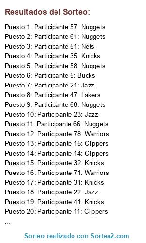 Lista de participantes: Participante 1: Bucks, Participante 2: Bucks, Participante 3: Bucks, Participante 4: Bucks, Participante 5: Bucks, Participante 6: Bucks, Participante 7: Bucks, Participante 8: Bucks, Participante 9: Clippers, Participante 10: Clippers, Participante 11: Clippers, Participante 12: Clippers, Participante 13: Clippers, Participante 14: Clippers, Participante 15: Clippers, Participante 16: Clippers, Participante 17: Clippers, Participante 18: Clippers, Participante 19: Jazz, Participante 20: Jazz, Participante 21: Jazz, Participante 22: Jazz, Participante 23: Jazz, Participante 24: Jazz, Participante 25: Jazz, Participante 26: Knicks, Participante 27: Knicks, Participante 28: Knicks, Participante 29: Knicks, Participante 30: Knicks, Participante 31: Knicks, Participante 32: Knicks, Participante 33: Knicks, Participante 34: Knicks, Participante 35: Knicks, Participante 36: Knicks, Participante 37: Knicks, Participante 38: Knicks, Participante 39: Knicks, Participante 40: Knicks, Participante 41: Knicks, Participante 42: Knicks, Participante 43: Knicks, Participante 44: Lakers, Participante 45: Lakers, Participante 46: Lakers, Participante 47: Lakers, Participante 48: Lakers, Participante 49: Lakers, Participante 50: Nets, Participante 51: Nets, Participante 52: Nets, Participante 53: Nets, Participante 54: Nets, Participante 55: Nuggets, Participante 56: Nuggets, Participante 57: Nuggets, Participante 58: Nuggets, Participante 59: Nuggets, Participante 60: Nuggets, Participante 61: Nuggets, Participante 62: Nuggets, Participante 63: Nuggets, Participante 64: Nuggets, Participante 65: Nuggets, Participante 66: Nuggets, Participante 67: Nuggets, Participante 68: Nuggets, Participante 69: Warriors, Participante 70: Warriors, Participante 71: Warriors, Participante 72: Warriors, Participante 73: Warriors, Participante 74: Warriors, Participante 75: Warriors, Participante 76: Warriors, Participante 77: Warriors, Participante 78: Warriors.