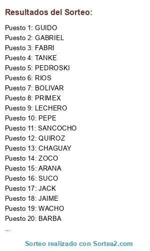 Lista de participantes: PEDROSKI, BARBA, FIDO, PRIMEX, ZOCO, JAIME, SUCO, HILARIO, GREGORIO, PILLETE, QUIROZ, PEPE, FABRI, BOLIVAR, JACK, CHAGUAY, TANKE, LECHERO, SANCOCHO, GUIDO, ARANA, GABRIEL, WACHO, RIOS.
