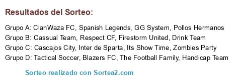 Lista de participantes: The Football Family, Tactical Soccer, Handicap Team, Respect CF, GG System, Blazers FC, Spanish Legends, Drink Team, Its Show Time, Pollos Hermanos, Zombies Party, Cascajos City, ClanWaza FC, Inter de Sparta, Firestorm United, Cassual Team.