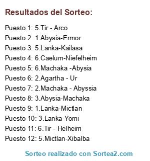 Lista de participantes: 1.Abysia-Ermor, 1.Lanka-Mictlan, 2.Agartha - Ur, 2.Machaka - Abyssia, 3.Abysia-Machaka, 3.Lanka-Yomi, 5.Mictlan-Xibalba, 5.Lanka-Kailasa, 5.Tir - Arco, 6.Caelum-Niefelheim, 6.Tir - Helheim, 6.Machaka -Abysia.