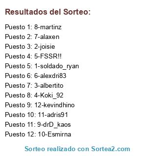 Lista de participantes: 1-soldado_ryan, 2-joisie, 3-albertito, 4-Koki_92, 5-FSSR!!, 6-alexdri83, 7-alaxen, 8-martinz, 9-drD_kaos, 10-Esmirna, 11-adris91, 12-kevindhino.