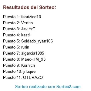 Lista de participantes: Soldado_ryan106, fabriziod10, JaviHrT, OTERAZO, algarcia1985, Kornich, Vertito, kasti, rurin , Maec-HM_93, jrluque.