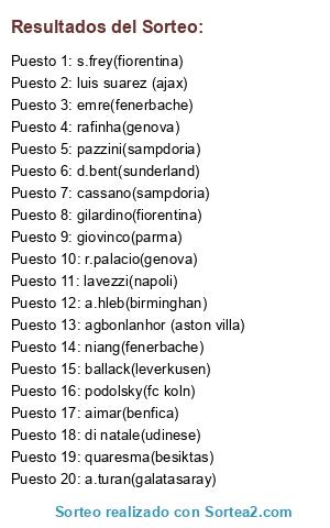 Lista de participantes: agbonlanhor (aston villa), luis suarez (ajax), a.hleb(birminghan), d.bent(sunderland), s.frey(fiorentina), gilardino(fiorentina), r.palacio(genova), rafinha(genova), lavezzi(napoli), giovinco(parma), cassano(sampdoria), pazzini(sampdoria), di natale(udinese), aimar(benfica), quaresma(besiktas), niang(fenerbache), emre(fenerbache), a.turan(galatasaray), podolsky(fc koln), ballack(leverkusen).