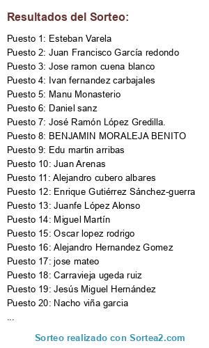 Lista de participantes: David Esteban , Francisco de santos, Lorenzo jesus rodriguez molina, Andrés callejo Sánchez , Javier Escudero, Noelia palmares múñoz, Hector obregon cano, Marcos lozano morcillo, José Manuel Valenzuela Andrés, Manu Monasterio, Roberto Macias Anta, Javir conejo magan, oscar martin ruiz, Daniel sanz, jose Antonio Lopez, Chule ortega del hoyo, Mariano Antona Sanchez, Ruben Rodriguez Gomez, Jose Antonio Garcia Archilla, Sergio martinez, Miguel Francés, Josema parada, Ivan fernandez carbajales, Oscar vilaboa, Antonio Sodupe tobia, Ricardo heres alvarez , Francisco José Romero Gómez , Jorge Juan González Borrego , Adán salgado, Mariano rubio diaz, Jose ramon cuena blanco, Julio gil rua, David Fernández Fernández , Carravieja ugeda ruiz, Raúl gonzalvo Andrés, Luis PedrazuelPedrazuela, Nacho viña garcia, Moisés Asensio , Jorge graña, Jose Miguel Ruiz, Luis miguel crespo morcillo, Pedro Manuel Calderòn Nieto, José Alberto blanco villagarcia , Enrique López Nieto, José Conde Galiano , David Pérez molina , José David Valdunciel Gonzalez, Juan Arenas, Santi pascual, Fran garcia, Alejandro vidales, Juanfe López Alonso , Rubas GD, ISAAC RODRIGUEZ MESONERO, Daniel Guijarro Bas , Antonio Jesús Romero Sosa, Antonio Acero Puerto, antonio mellado zamora, Alvaro Zapata Romero, Alejandro Hernandez Gomez, Juan carlos infante infante, Fernando palo zarza , Isaac lozano , Daniel Guijarro Moral, jose manuel sanchez cartillejo, jose Candelas , Luis carmona calderon, Miguel Angel Lozano, Miguel Mena salcedo, Alberto muñoz martin, David Marin Laguna , Aitor PC, Fermin Àlvarez Mèndez, Oscar lopez rodrigo, Miguel Vázquez CR, José Luis García Martínez, Laureano Fernández Vega, Paco Chousa, Pablo lopez diaz, Jesús Velasco , Daniel Fernandez Blanco, Rodrigo llamas garcia, Francisco Javier Salguero solis, Alejandro cubero albares, Sebastian giraldez ferreira, jesus diaz vazquez, Sebas martin hernandez, Victor cabero, Jose antonio valińa, Narciso prieto montalvo, Esteban Varela , Ángel juan , Adrian Gago, RAUL BODAS LOPEZ, Lorenzo ponce, Angel , Rodriguez morchon , Angel Herrero Ibañez, Manuel Ángel Pazos Rúa, jose domingo lema lires, Juan Carlos esteban González , Gonzalo Toledano Hernández de la Huerta , Celerino Bermejo Rodriguez, Adrian Güemes Diez, Sergi Roure Montserrat, Joaquín López escorza, Roberto Hernando Peñalba, M Ángeles Rosado Peinado , J Carlos Guijarro, Tinin Fernández, Jonathan veliz meliton, Juan Francisco García redondo , Alvaro álamo garcia, Miguel angel crespo sanchez, Mario Benito moreno, Diego Sanchez garcía , Juan Ramón Alonso Martín , María J Jiménez, Jaume Forteza Nadal, javier giraldez carballo, José Ricardo Pellicer Jordán, José Ramón López Gredilla., JOSE TRASANCOS FERNANDEZ, Jose Carlos gonzalez. "Estakas", Jose Rodriguez, Jose Maria Nocete Olmo, Francisco Jose Calleja Moreno, Miguel Angel Jiménez Fernández , Laude dominguez, Esmeralda muñoz, Dani Villanueva Jareño , Juan Carlos dominguez, Manuel Gallardo, José David Campillo lopez, Daniel Santamaria Eduarte, Jesús Miguel Hernández, marcos rodriguez rodriguez, fernando muñoz benito, OSCAR MARTIN RUIZ, BENJAMIN MORALEJA BENITO, Verónica Olmo Fernández, Eusimio Reguera Santamarta, Alberto Cano Garcia, Jose A Gracia Archilla, Enrique Gutiérrez Sánchez-guerra, Miguel Martín, Miguel Mmh, Daniel Garcia Perez , pedro manuel casado foncea, Javier conejo magan, celso moran , Gerardo Montejano, Jose Luis Aguas García, CARLOS GARCIA MUÑIZ, Marcos Soria, Carlitos sanchez ramos, Abel castel, Noelia Palomares Muñoz, Carlos sanchez ramos, Edu martin arribas, José Jiménez, José María Raya Miranda , luis carlos campos, Eduardo Rojo Villardon, Bauti Alvarez Garcia , jose mateo , Javier Marqués w, luis carmona calderon, JOSE IGNACIO GARCIA VELLOSO, .