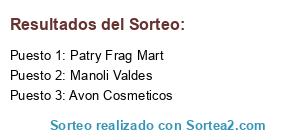 Lista de participantes: Emma Arguiz, Maria Eugenia Arias Lozano, Vanessa Muñiz Alvarez, Maria R Simon, Manoli Valdes, Nieves Moreno, Jennifer Romero, Merche Félix, Veronica Sumillera, Alla Larionjva, Mari CambioRopa, Sofia Esther Ruiz Garcia, Veronica Gomez, Karina Ceballo, Patry Frag Mart, Mónica Herrerías, Jennyfer Del Amo Sanchez, Pepi Romero Alvarez, Eva García García, Jamilie Rodriguez, Gloria Bes, Beatriz Crem, Javier Gonzalez, Marta Montero Toro, Sonia María González Vázquez, Ainodea Manualidades, Cesar Eduardo da Silva, Almudena Arocha Martos, Angela Carpente Garcia, Fely Rivero, Lucia Xaica, Alicia Carrero Marcos, Liz Medina, Ayna Trotamundos, Marcela Ulehla Mrazova, Dolores Amador Moreno, Concepcion Matias Simarro, Chelo Moa, Irene Diaz, Sandra Ferré, Pilar Moreno Madrid, Martamiguelana Beni, Noelia Laredo Expósito, Corner Once, Loli Navarro, Alberto Santander Martínez, Vania Yosselly Ptaires, Li Dia Lour, Manuel Torres, Reebe MoReniitah, Ana Maria Ramos, Mamen RM, Alicia Palomar de Oses, Encarni Sanchez Alanis, Desirée Ramírez Santano, Lore Saez, Gemma Arbós, Teresa Garcia Sanchez, Rosado Moreno Fita, Juan Espinosa, Concursos Sorteos Regalos, Maria José Valdés Castro, Tu Estilo Lencería Fina, Luigi Chaparro Romero, Paweł Kiljan, Myriam Adsuar Paez, Luisa Maria Garcia Repiso, Cristina Escribano Gutierrez, Mami Duna Carolina, Juan Manuel Ros, Rogelio Gorris Cuenca, Sandra Ramirez Llacer, Soledad Rodriguez Lopez, Corina Diana Radu, Leire Rodriguez Apuntateygana, Yessica Lloret Márquez, Cassandra Ruiz Ibáñez, ElTiovivo Mágico Moda Complementos, Paweł Kot, Eliata Timorata, Nuria Perez Ortega, Cristina Rogoz, Lali Pujala, Silvia Valle, Carmen Calderon Gordon, Inma Garcia Vaca, Angel DmGordon, Carlos Dinamita Santander Gil, Edelweïss Valls Punzón, Cristian Gomez, Avon Cosmeticos, Carolina Fernandez, Belen Risco Rojas.