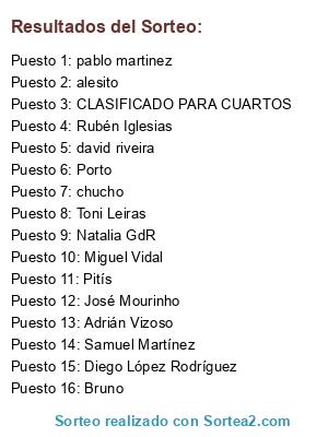 Lista de participantes: José Mourinho, alesito, Adrián Vizoso, Toni Leiras, chucho, david riveira, Miguel Vidal, Diego López Rodríguez, Natalia GdR, Samuel Martínez, Rubén Iglesias, Bruno, pablo martinez, Pitís, Porto, CLASIFICADO PARA CUARTOS.
