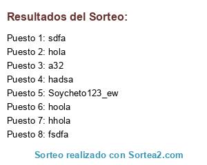 Lista de participantes: Soycheto123_ew, hola, hoola, hhola, hadsa, sdfa, fsdfa, a32.
