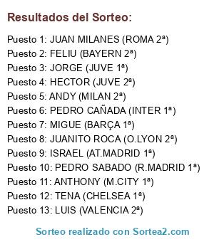 Lista de participantes: PEDRO SABADO (R.MADRID 1ª), TENA (CHELSEA 1ª) , MIGUE (BARÇA 1ª) , HECTOR (JUVE 2ª) , LUIS (VALENCIA 2ª), ANDY (MILAN 2ª), JUANITO ROCA (O.LYON 2ª), PEDRO CAÑADA (INTER 1ª), JORGE (JUVE 1ª), JUAN MILANES (ROMA 2ª), ANTHONY (M.CITY 1ª), ISRAEL (AT.MADRID 1ª), FELIU (BAYERN 2ª).