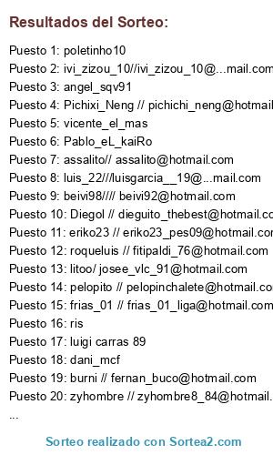 Lista de participantes: ruben-94_, osvaldiito s, MeSSiDoNa_Pa, JosePolo, ris, mescamilla, Van_Nicky, ismaeljimva, {makiki}, Pablo_eL_kaiRo, gutistas, javict, poletinho10, dani_mcf, angel_sqv91, cortex, alixon11, espI, sete, @alexisbetico12, @rubenyanes57, @alex_fl2004, @daviddiaz81, @fitipaldi_76, @oretra_anidem, @zequi_pes, @beivi92, @iban_grao, @dj_trippy_sanfer, danicanario, @pelopinchalete, @hintoni, flakojmays, @assalito, Snaidej, @fernan_buco, luigi carras 89, @dga_8, @jorgealaez, @frias_01_liga, john_terry, fuentesiko, @eriko23_pes09, @atleticosss, @moisesito, @lolito_er_crack, @pipo_erica, robirichu, wladi_kito, ExOn_TOGa_10, @navarrete_099, @er_makina1989, @francis15pes, @imanol_martinez, @charly_shanero, @rafana04, @Nacho_pes, @david.tillo, Sir Kaisser, vicente_el_mas, @jawbcn, @michaelbacas, @harrytxu, @xdominx, @pichichi_neng, @pepechia, @zyhombre8_84, @Perdy_trs, xXSeVi_STyLeXx, @bcq_85_, @egidopau, @israel_febrero, @angelcop83, michel_sanfer, @xori_12, raimon_13, @djroybdn, Wilgis Sosa, @luisgarcia__19, @dieguito_thebest, @jrubio_herrera, @cristians_23, tomasyto25-tomce2, Fantasma_Loko, @ivi_zizou_10, @josee_vlc_91.