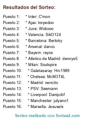 Lista de participantes: * Barcelona: Bertoky, * Madrid: nencito, * Atletico de Madrid: dennys5, * Valencia: SikO124, * Manchester: julyano1, * Liverpool: Danipcbf, * Chelsea: McM3T4L, * Arsenal: danco, * Bayern: reyox, * Inter: C'mon, * Milan: Soulspire, * Juve: Wokooo, * Galatasaray: Hrc1989, * PSV: Seemann, * Ajax: torpedoo, * Marsella: Jesuselx.