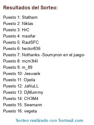 Lista de participantes: vegeta, RaulSFC, Niklas, m_89, mcm3t4l, Nothanks -Soumynon en el juego-, CH3M4, hector836, maxifar, Ojeda, Seemann, Jesuselx, JaNuLL, DjMummy, HrC, Statham.