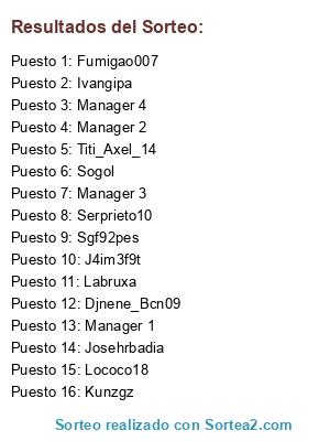 Lista de participantes: J4im3f9t, Sogol, Djnene_Bcn09, Ivangipa, Fumigao007, Josehrbadia, Serprieto10, Lococo18, Kunzgz, Labruxa, Titi_Axel_14, Sgf92pes, Manager 1, Manager 2, Manager 3, Manager 4.