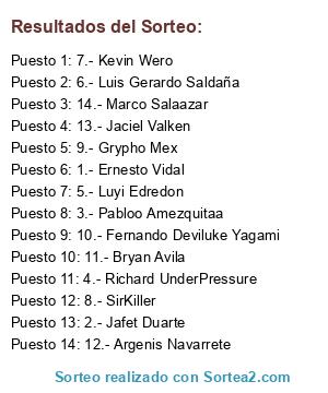 Lista de participantes: 1.- Ernesto Vidal, 2.- Jafet Duarte, 3.- Pabloo Amezquitaa, 4.- Richard UnderPressure, 5.- Luyi Edredon, 6.- Luis Gerardo Saldaña, 7.- Kevin Wero, 8.- SirKiller, 9.- Grypho Mex, 10.- Fernando Deviluke Yagami, 11.- Bryan Avila, 12.- Argenis Navarrete, 13.- Jaciel Valken, 14.- Marco Salaazar.