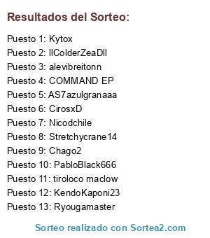 Lista de participantes: KendoKaponi23, PabloBlack666, Stretchycrane14, COMMAND EP, CirosxD, tiroloco maclow, Ryougamaster, llColderZeaDll, alevibreitonn, Chago2, Kytox, Nicodchile, AS7azulgranaaa.