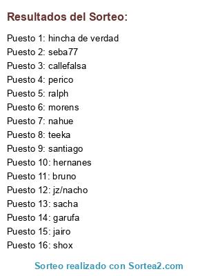 Lista de participantes: perico, bruno, ralph, santiago, callefalsa, jairo, morens, hernanes, sacha, shox, hincha de verdad, teeka, seba77, garufa, nahue, jz/nacho.