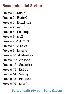 Lista de participantes: -SikO124, -HrC1989, -nencito_, -ivo21, -Dstroy, -Miguel, -Soulspire, -BuzzFuzz, -Wokooo, -Laudrup, -BurfoK, -julyano1, -jonar1, -Dabledore, -e.kasta, -Valeny.