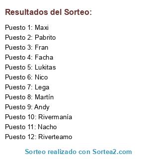 Lista de participantes: Andy, Pabrito, Maxi, Rivermanía, Riverteamo, Facha, Fran, Lega, Lukitas, Martín, Nacho, Nico.